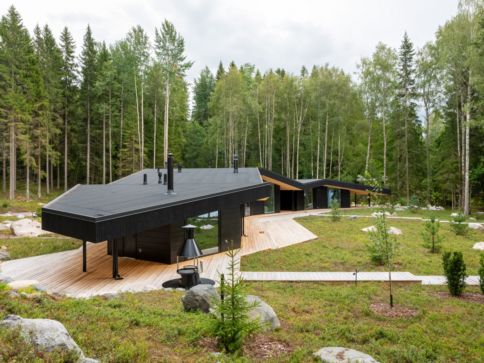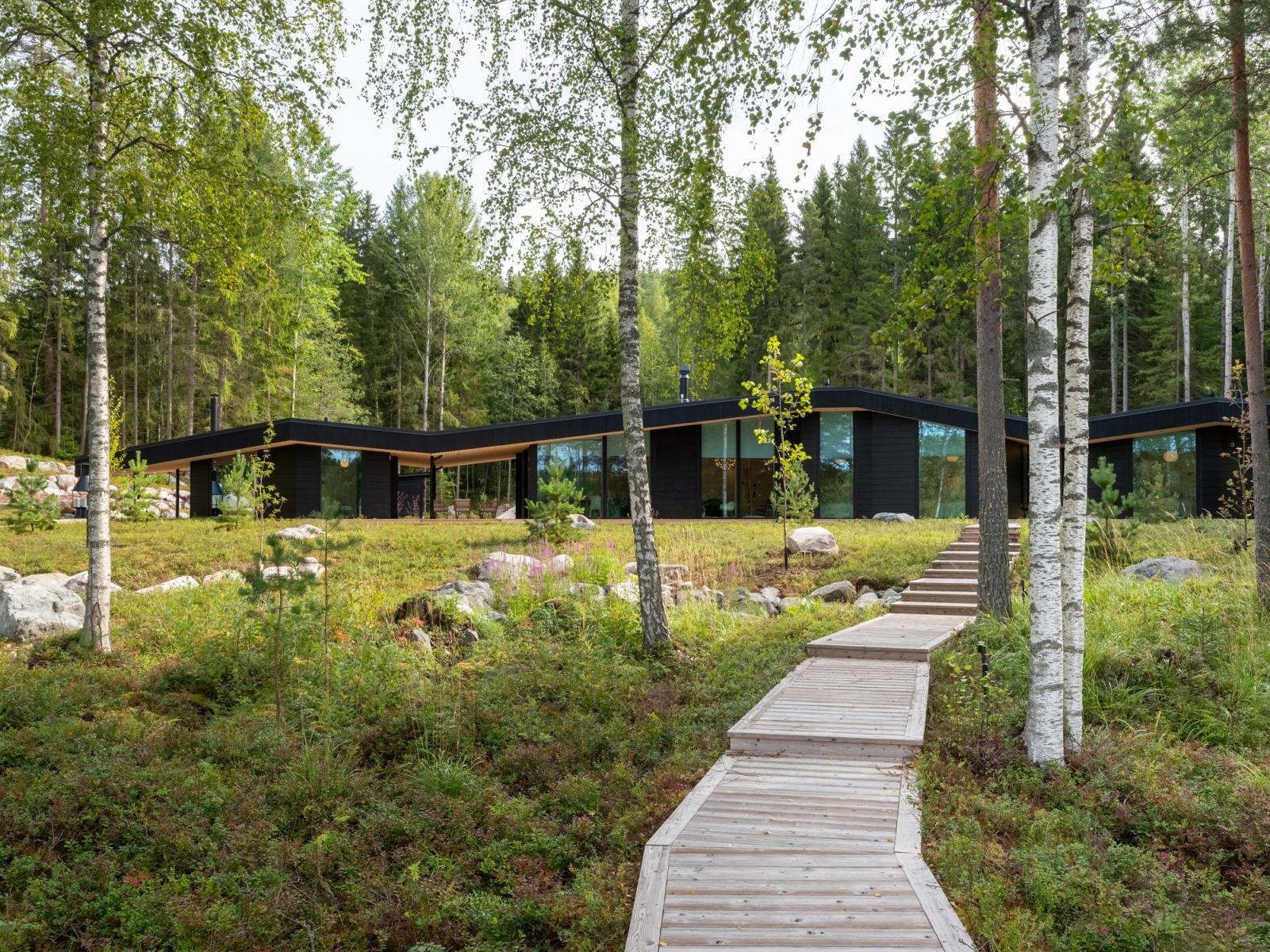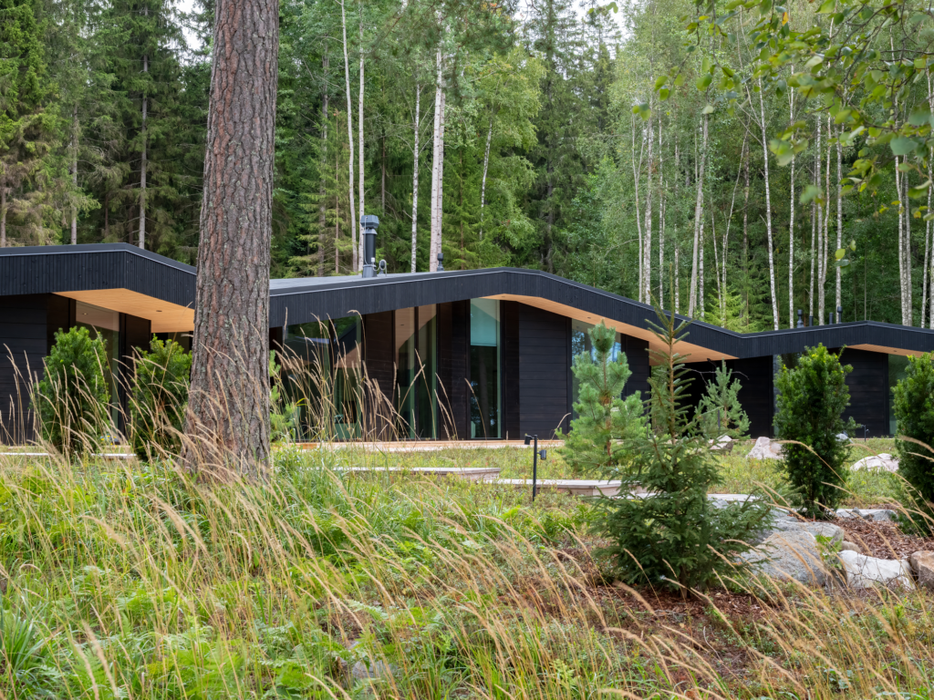 Die Baukörper sind niedrig gehalten, die dunkel behandelten Blockbohlen verschmelzen optisch mit dem Wald im Hintergrund. Das Grundstück wurde so naturbelassen wie möglich gestaltet. Bäume im Garten und entlang des Ufers blieben erhalten, um die Privatsphäre zu wahren und den ursprünglichen Charakter des Ortes zu schützen.
