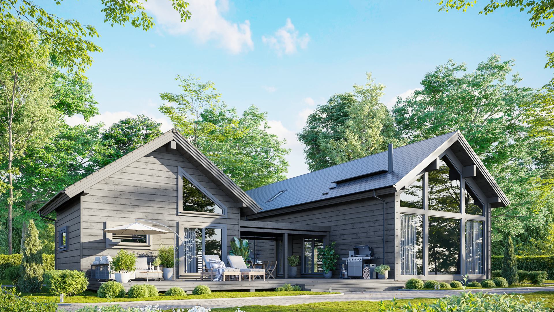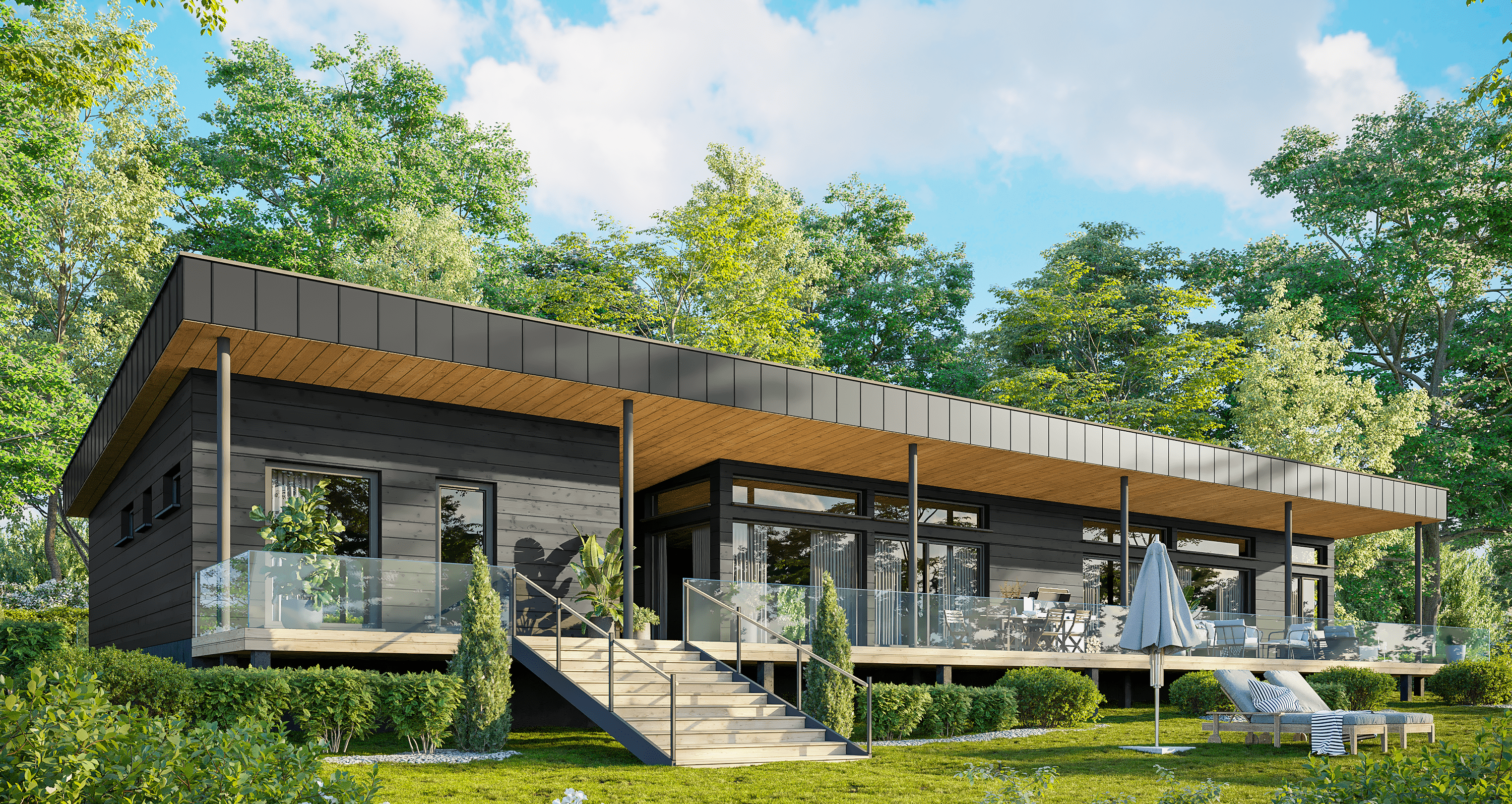 2. Modi – Ein modernes, minimalistisches Blockhaus mit klaren Linien und effizienten Raumlösungen für kleinere Grundstücke.
