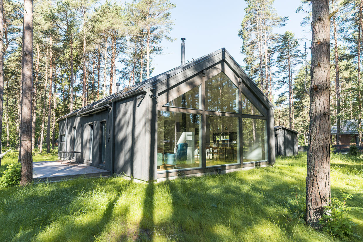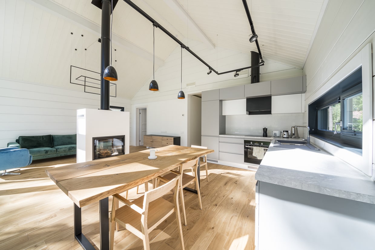Holzhaus Seide ist ein großzügiges einstöckiges Holzhaus, dessen offene Küche und Wohnzimmer ein weites und lichtdurchflutetes Zuhause schaffen. Wohnzimmer und Küche sind mit einer gemütlichen überdachten Terrasse verbunden. Das Haus verfügt über zwei geräumige Schlafzimmer, eine Sauna, einen Waschraum und einen Technikraum.