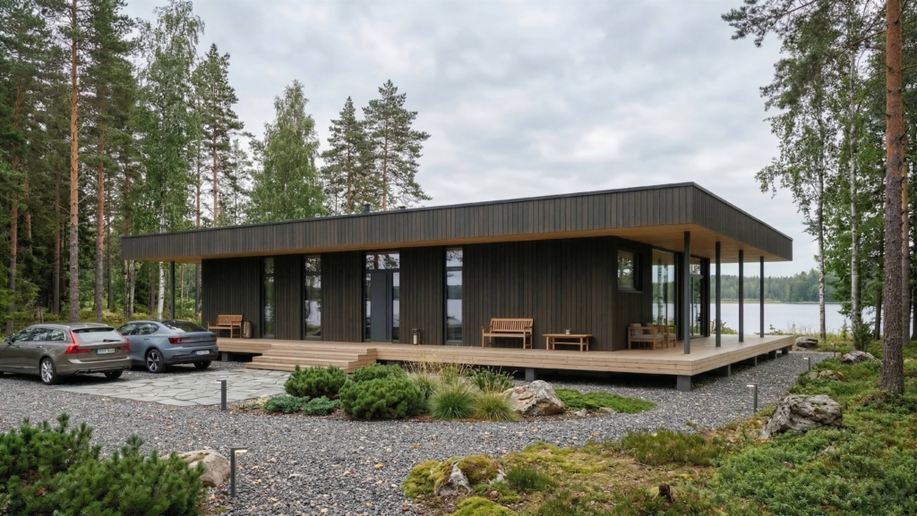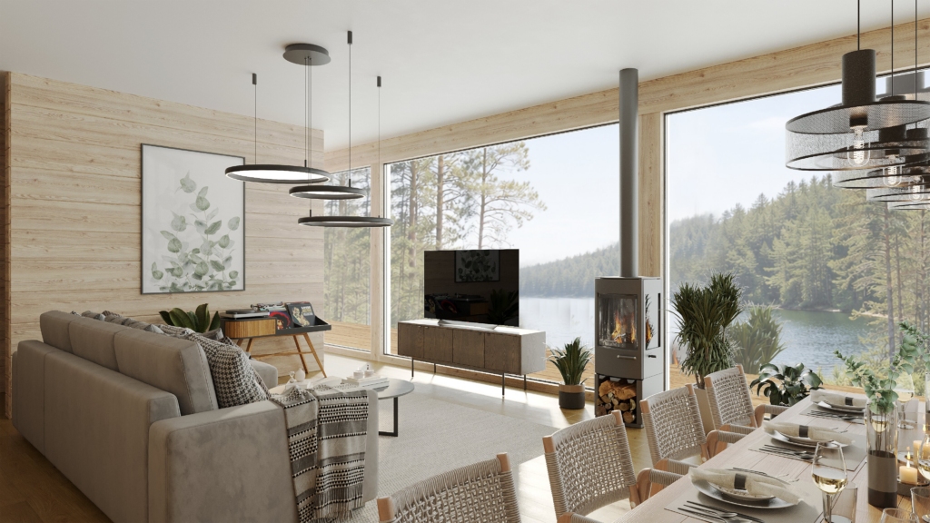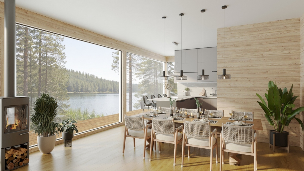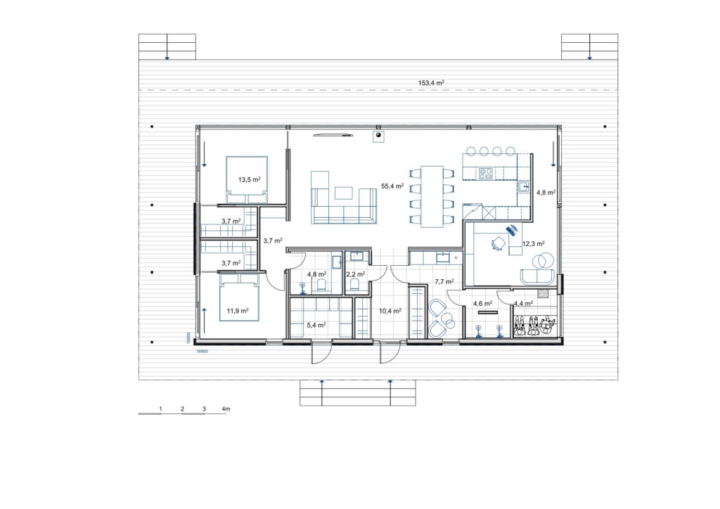 Bei der Entwicklung des Musterhauses Eirene wurden die Wünsche und Rückmeldungen der Bauherren berücksichtigt. Der Grundriss des Gebäudes ist in zwei Bereiche unterteilt: private Schlafzimmer auf der einen Seite und ein großzügiger, gemeinsamer Wohn- und Küchenbereich auf der anderen. Der Grundriss kann an die Wünsche und Bedürfnisse der Familie angepasst werden – beispielsweise kann bei Bedarf ein zusätzlicher Schlafzimmer durch eine entsprechende Verlängerung eines Gebäudeflügels ergänzt werden.