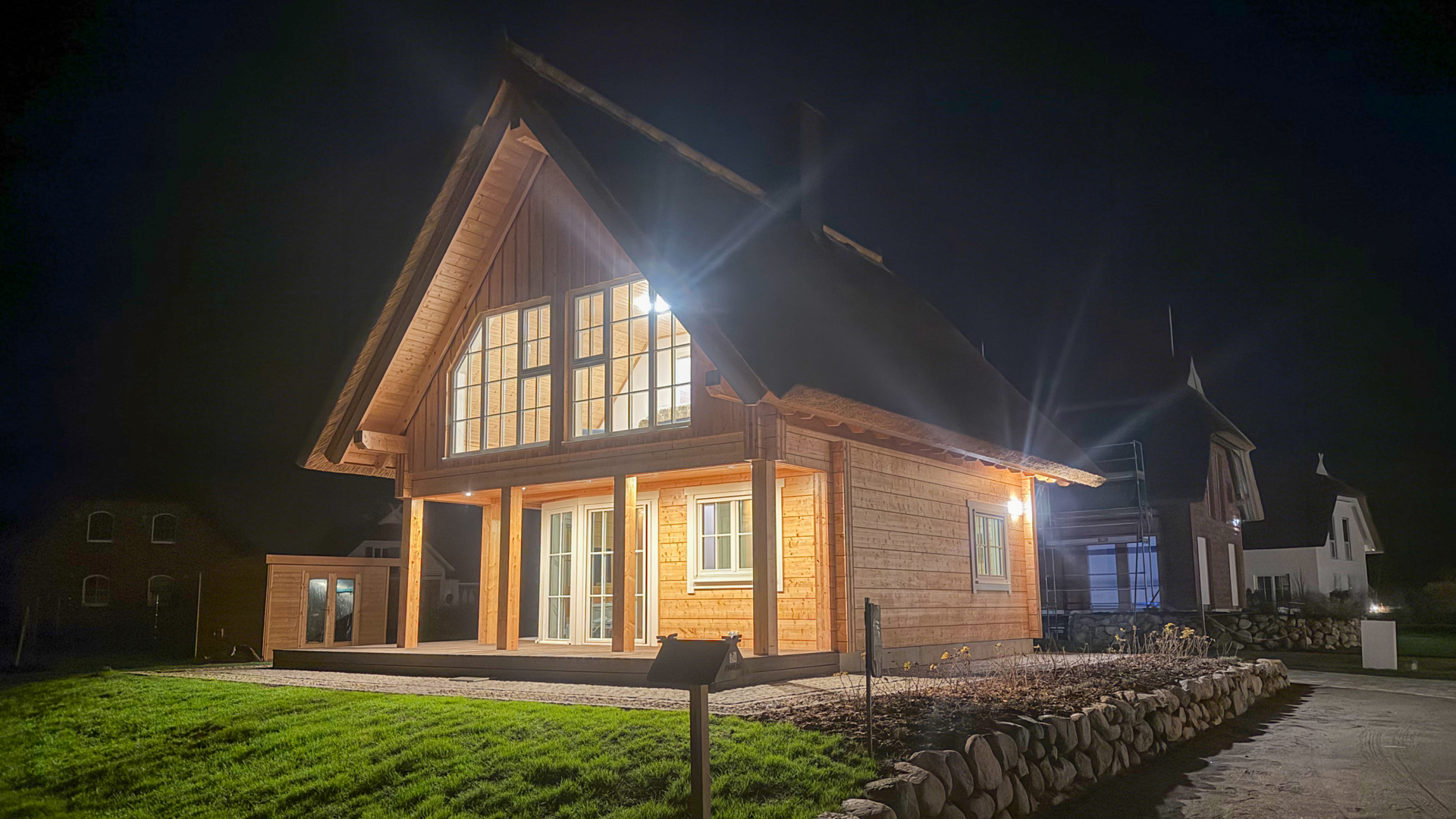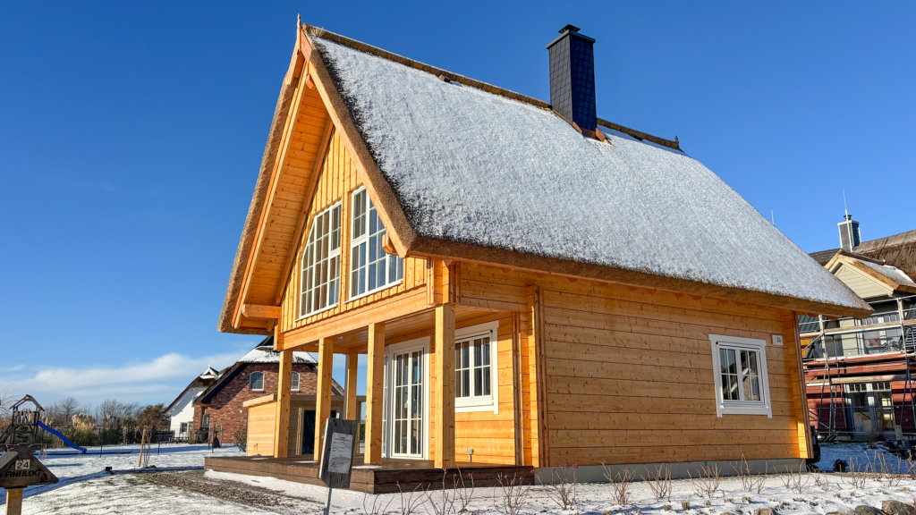 Genau in diesem Kontext hat Finnlog ein exklusives Ferienhaus realisiert: ein modernes Blockhaus, das zeitgemäßen Komfort mit regionaler Reetdach-Architektur verbindet.