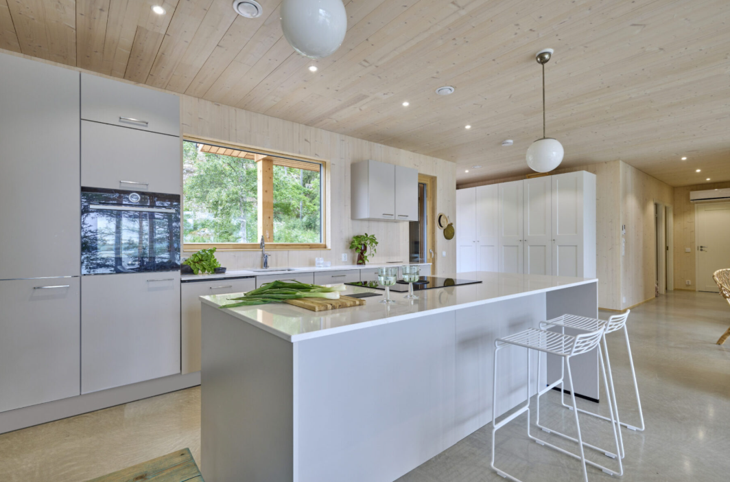 Das Haus verfügt über vier Schlafzimmer sowie eine großzügige, offene Küche mit Wohnbereich, ein klassisches Holzhaus-Szenario für gesellige Zusammenkünfte. Eine große Terrasse umgibt drei Seiten des Hauses und bietet großzügige Außenbereiche mit wunderschönem Blick auf das Meer.
