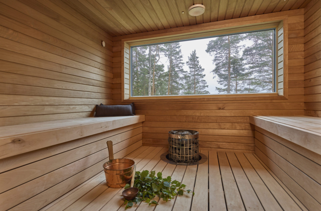 Das neue Sommerhaus ersetzt die ursprüngliche Hütte aus dem Jahr 1932. Die geliebte alte Sauna von 1957 ist weiterhin in Betrieb, ergänzt durch eine moderne Indoor-Sauna mit weitem Blick aufs Meer.